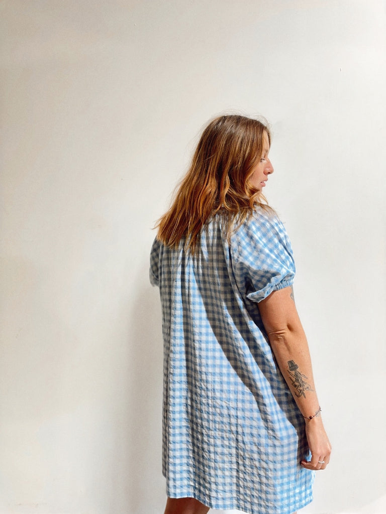 The Forget Me Not Dress is an easygoing piece made for everyday wear. Its relaxed fit and dusky blue gingham fabric keep things comfortable and simple. Short puff sleeves add just enough style, and the handy pockets are perfect for stashing your essentials. The extra length at the back is ideal for running after your little humans at the park, giving you a bit more coverage without any fuss.