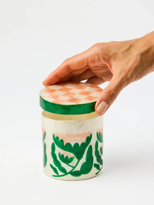 Blush and green checks and florals give this medium Capiz shell box fun feminine sophistication on vanities and shelves. Designed in Sydney and crafted by skilled artisans, each piece celebrates the natural luminosity of the shell through colour and finishing. Perfect for storing rings, earrings, or small keepsakes, team with the Paradis trays and boxes for a collected aesthetic.