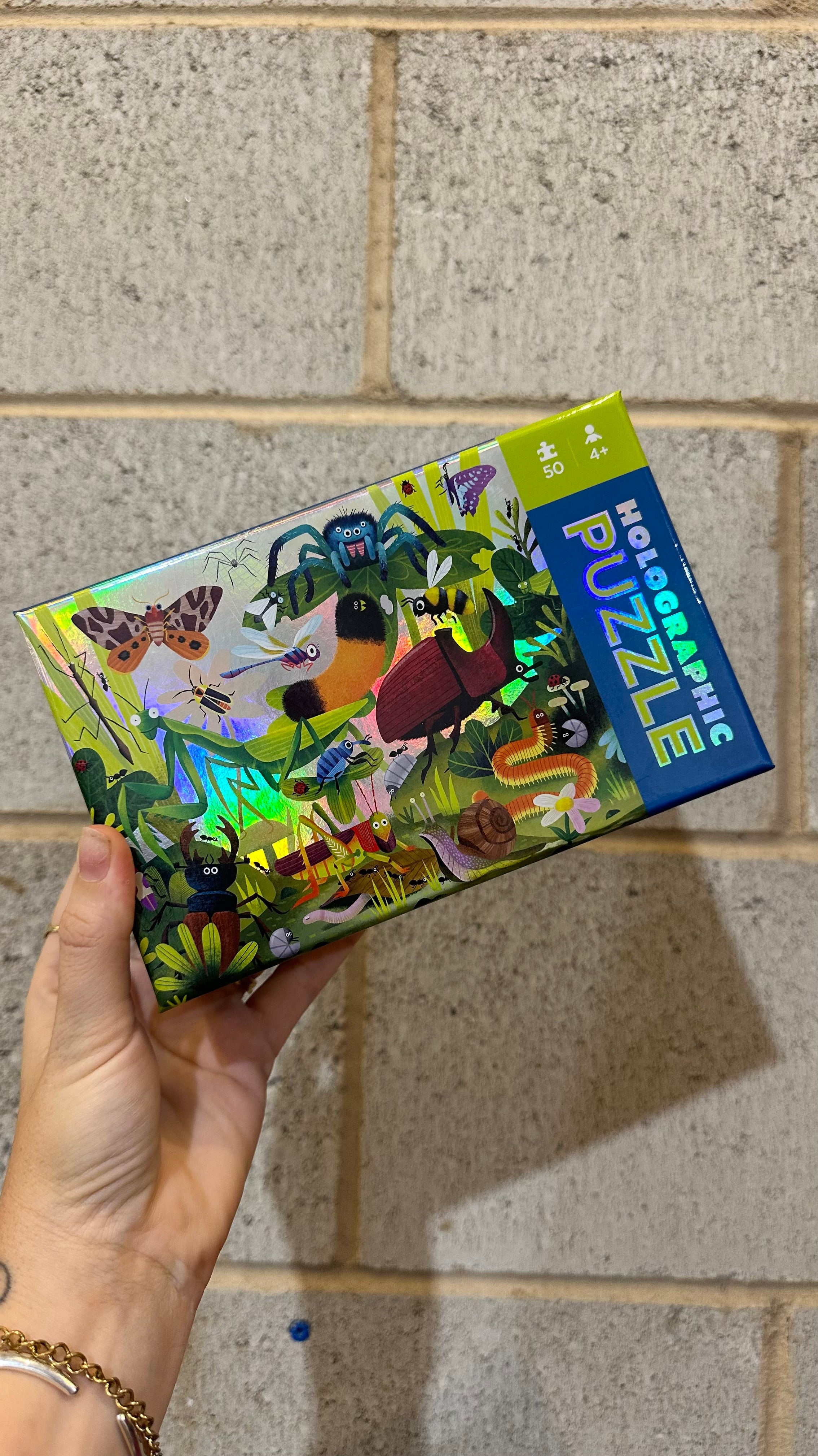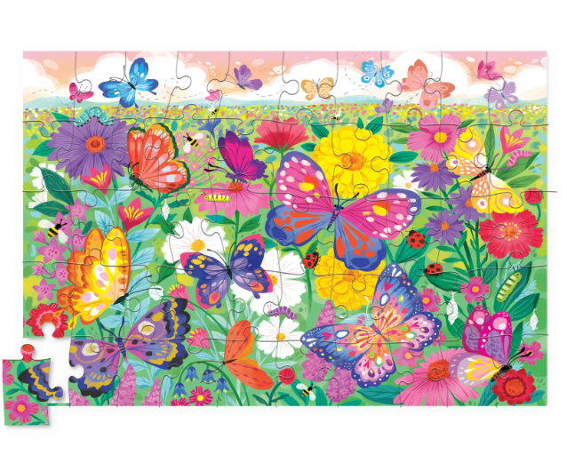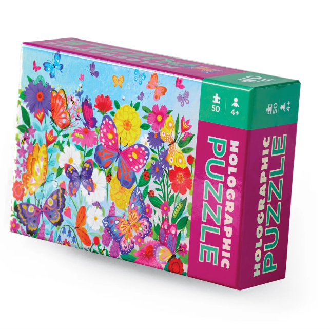 Sparkly delight! Discover a magical butterfly garden with this 50-piece holographic puzzle! Bring the adventure to life with dazzling foil accents and vibrant, detailed illustrations while developing puzzle-solving skills and hand-eye coordination. Crafted with high-quality blue board and soy-based inks, this puzzle will amaze and delight for years to come.