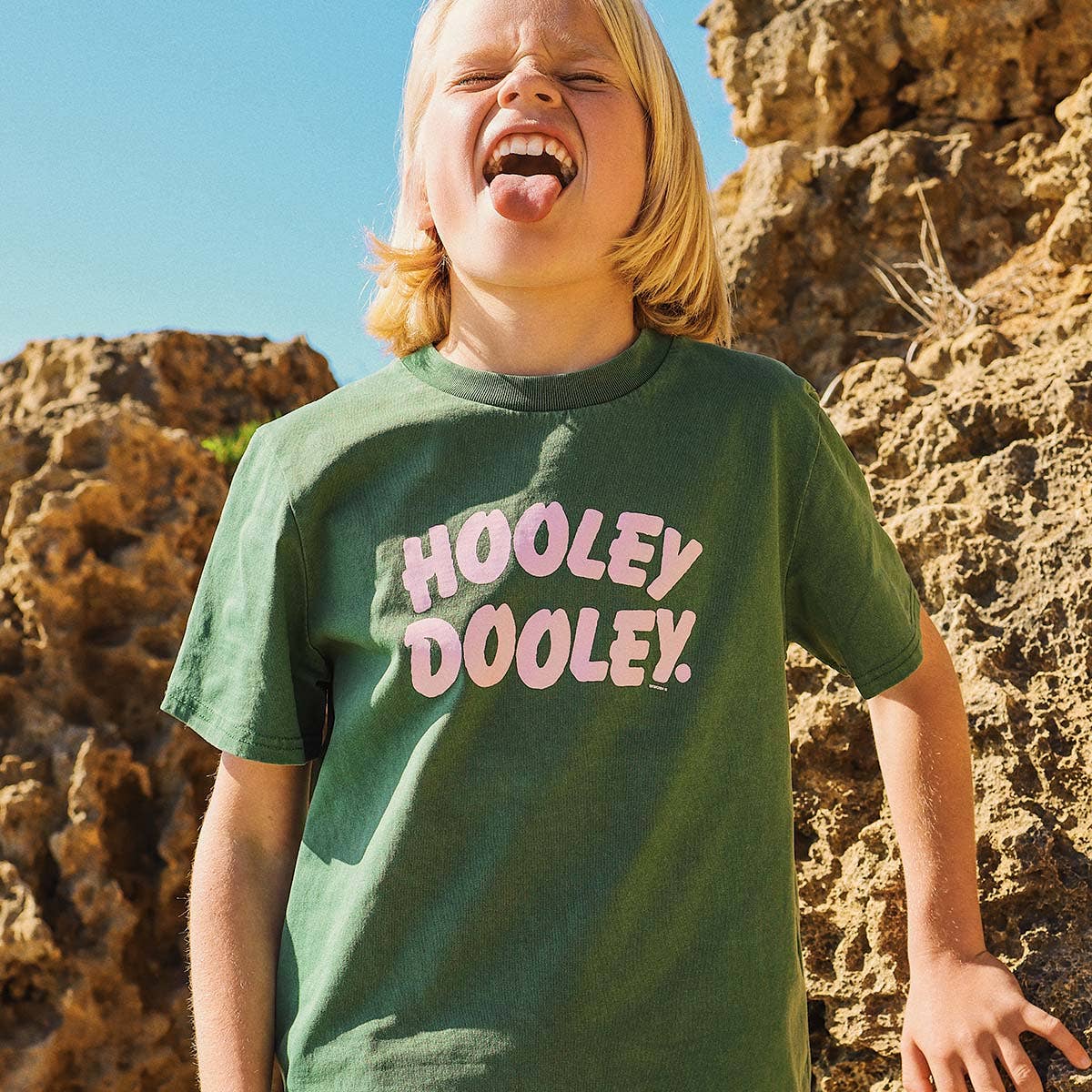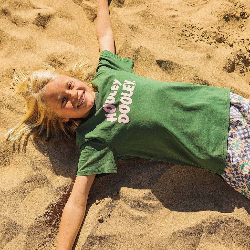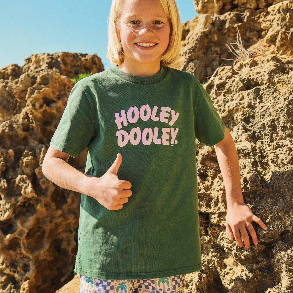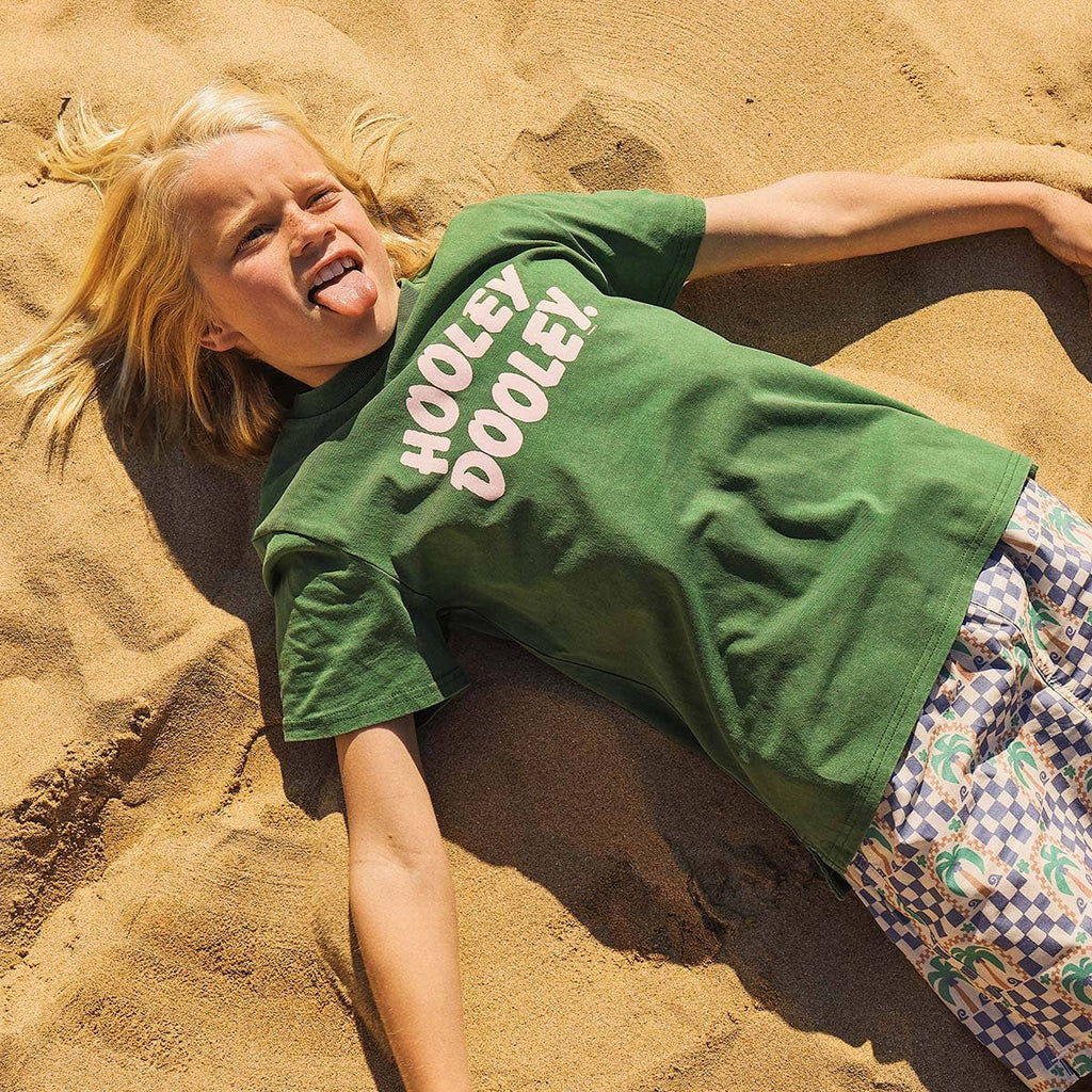 Bring a burst of fun to little wardrobes with the Hooley Dooley Kids Slang Tee in Green. Made from soft, breathable cotton, this regular-fit tee features bold puff print Aussie slang on the front, a ribbed neckline, and a high-low hemline for all-day comfort. Perfect for playground adventures, weekend outings, or relaxed home days, it’s a playful essential for sunny summer vibes.
