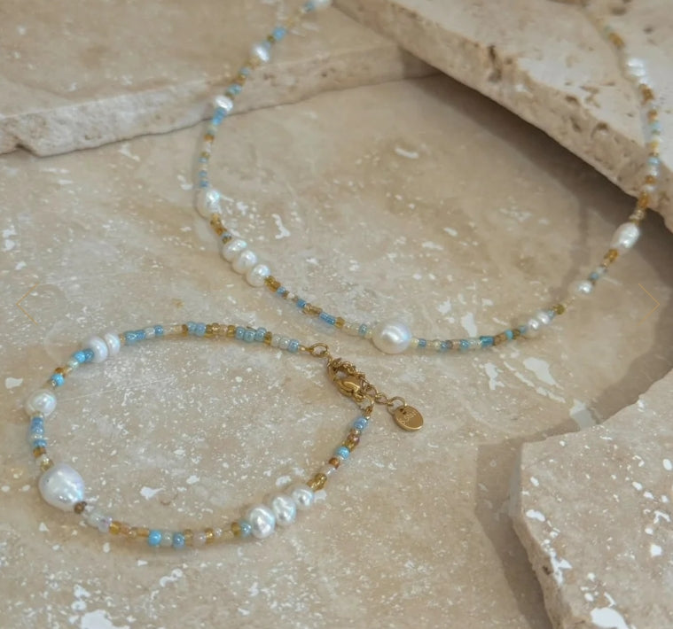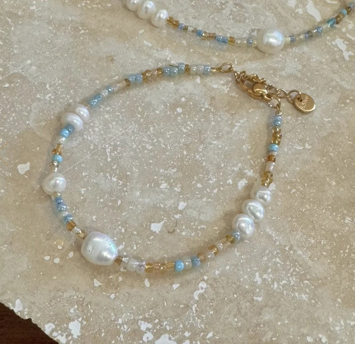 NEW Starlight or Perfectly pearly white or Pebbly beach mix of warm tones, Tan, beige, sand, and a touch of gold & blue 2mm glass seed beads with a scatter of randomly sized freshwater pearls.