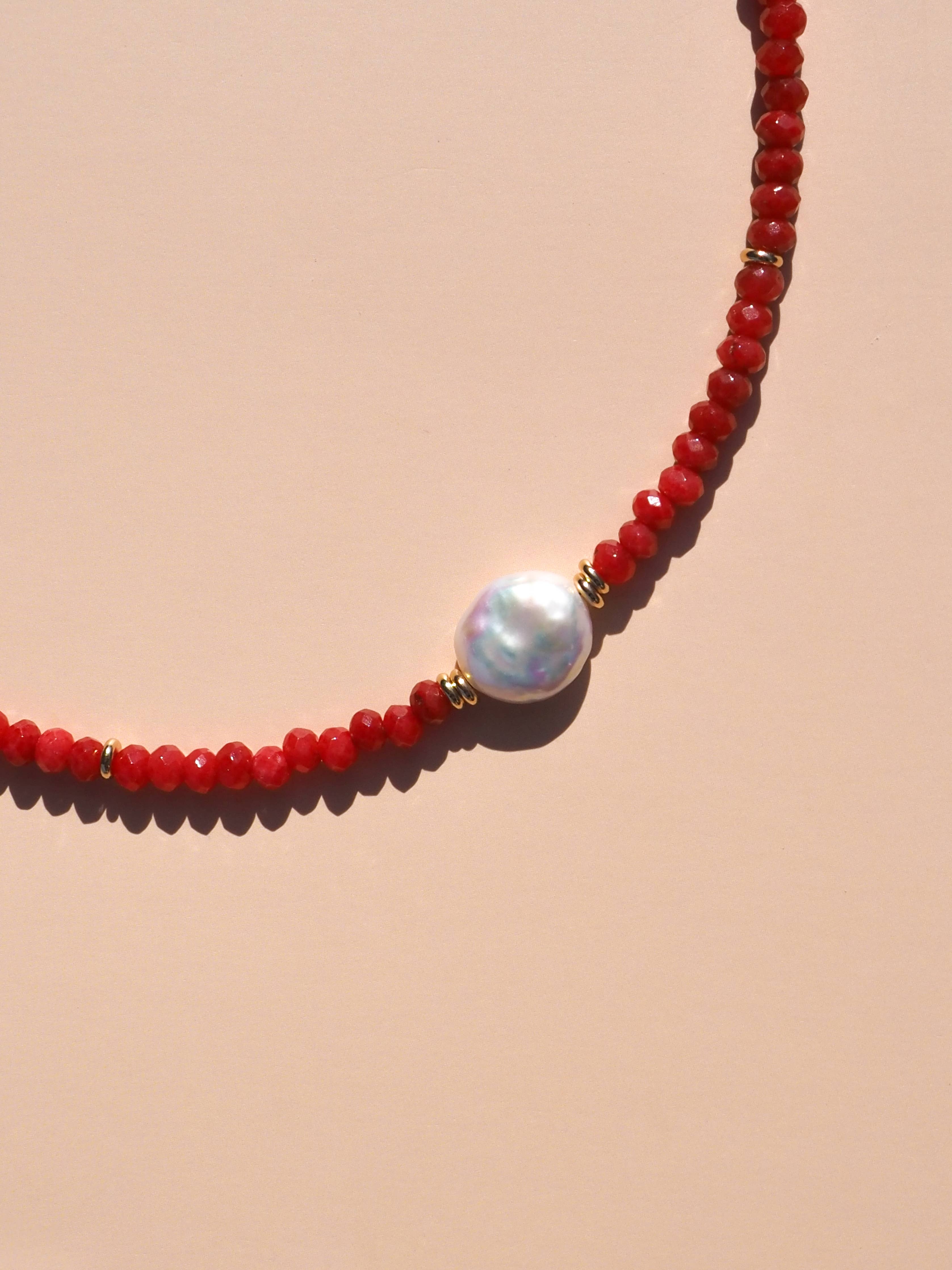 Freshwater Pearl with Red Gemstone Beaded Necklace