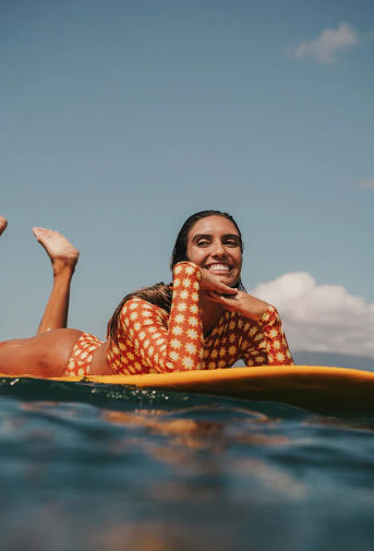 Introducing our sustainable swim Haven Surf Top In Chocolate designed for surfers and for those who are after a little more sun protection, perfect for those who want to dance through the waves. You may want to know why is this top perfect for surfing, well it features a double lining to the same print to keep you secure but is single-layered on your arms to keep it breathable. This means our Haven Top is sure to stay in place when you’re surfing. Our Haven Top is also seamless so there is no digging in and will feel so soft on your skin. Our Day Dreamer + Sundew prints seen on our Haven Surf Top is hand-drawn and exclusive to us so you can’t find it anywhere else which we think is pretty cool.
