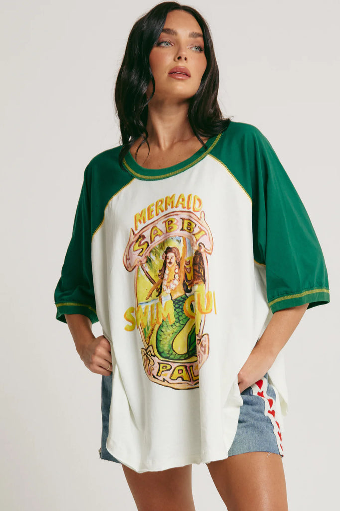 Designed in our relaxed, oversized silhouette, this tee features contrast sleeves and neckline for that retro sport vibe, plus hand-drawn mermaid artwork front and back (because yes, mermaids are real 💅). It’s soft, easy, and made for days spent salty, sun-kissed and slightly unhinged, the Sabbi way.