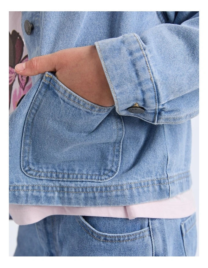 Complete any outfit with the Billie Denim Jacket by Eve Girl. This jacket is made from a rigid denim fabrication, and features a pale pink corduroy collar, self fabric patch pockets and branded metal shank closures.