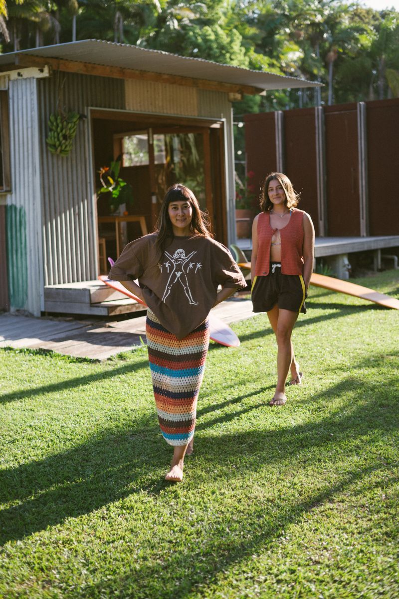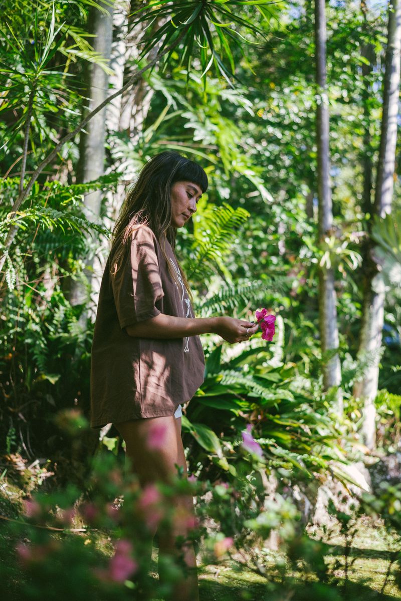Introducing the Bush Woman tee in a new colourway, honoring the wild woman that lives in us all. The one who runs naked to the waves, who lets it all hang out and is the most beautiful because of it. An oversized fitting t-shirt featuring a slouchy silhouette and finished hem. Cut on the bias for an asymmetric fit.