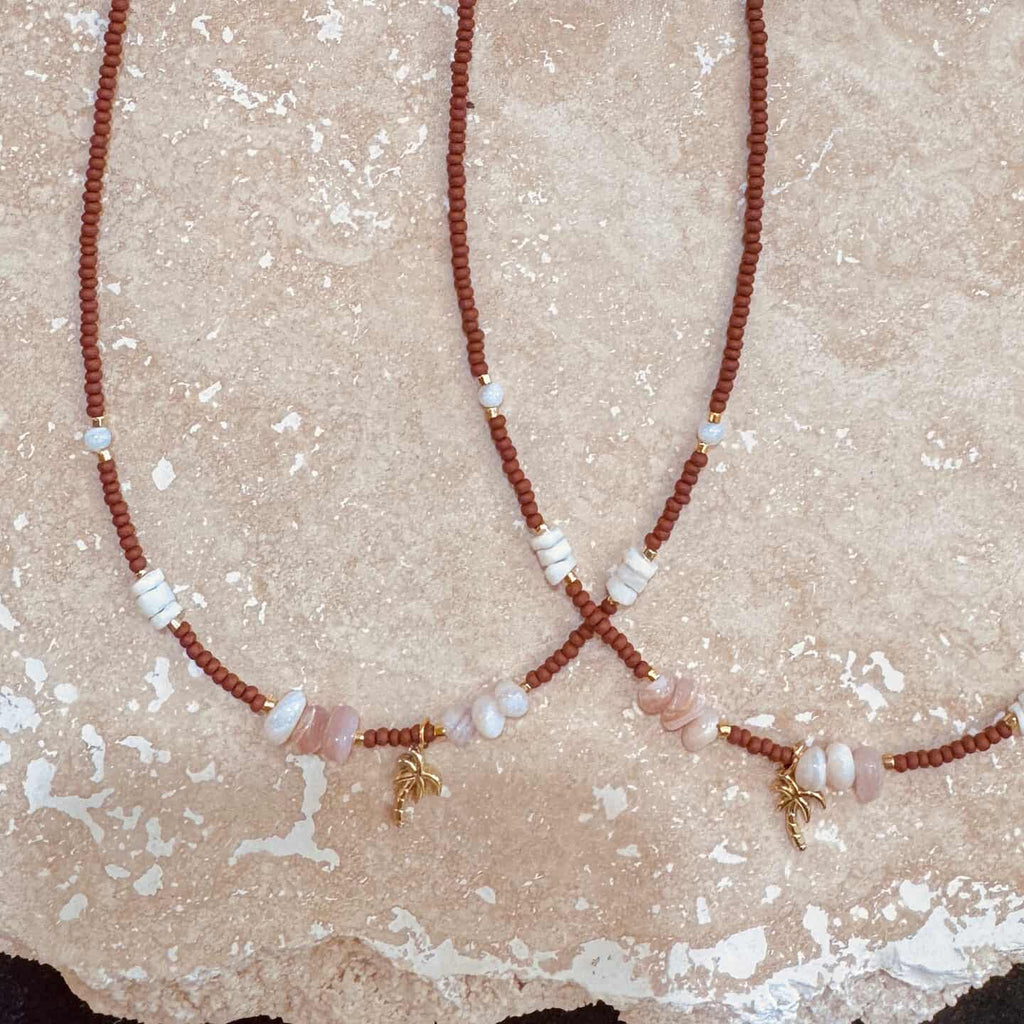Gold plated stainless steel beaded necklace with real shells and palm tree charm.