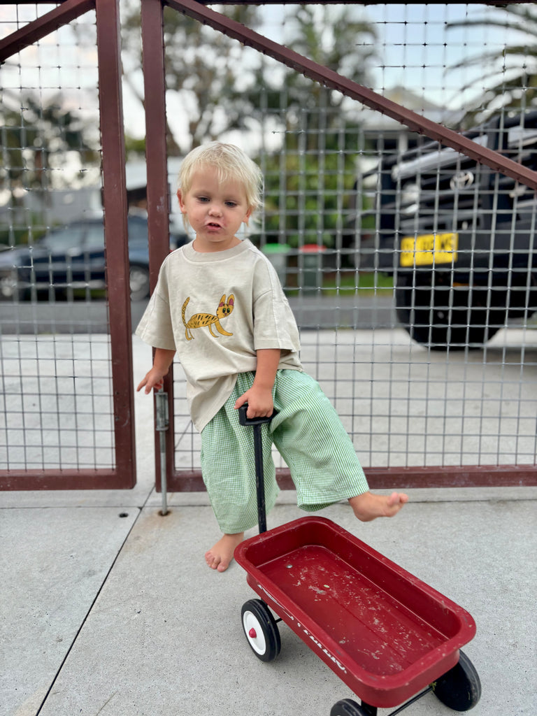 These oversized kids’ pants in green gingham bring playful style and comfort together. Featuring a fun orange lining that peeks out when the cuffs are folded, inspired by Trolli Sour Lolly Snakes, they add a cute pop of color. Designed with a true-to-size oversized fit, these pants offer plenty of room for movement and growth.